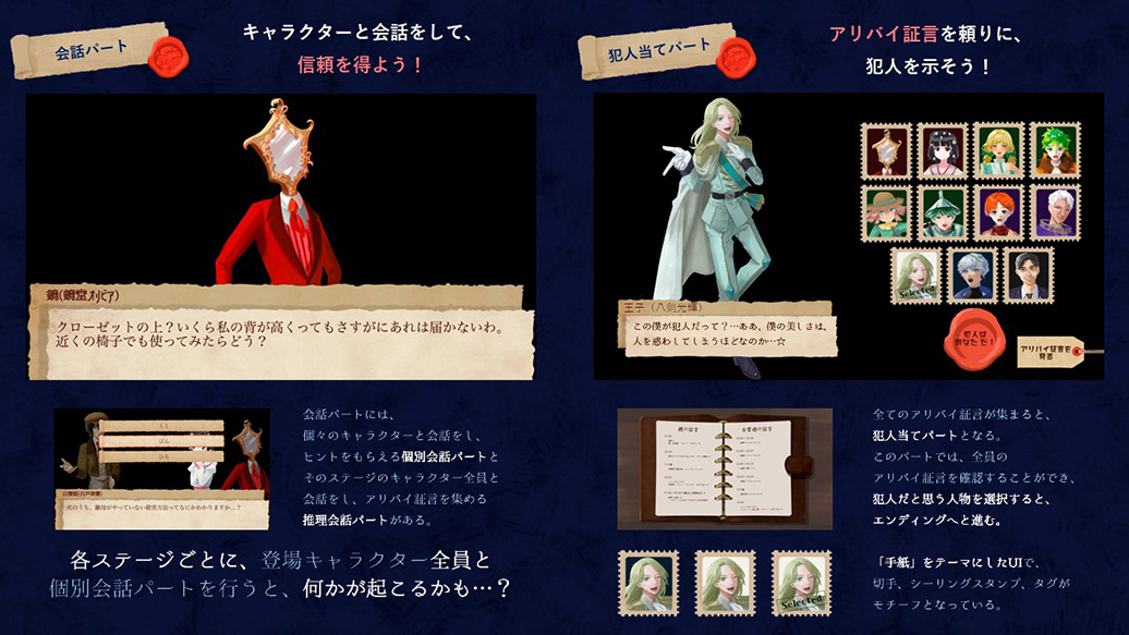 舞台の謎を解き明かしながら爆弾を解除し、アリバイ証言を頼りに11人の容疑者の中から犯人を見つけ出せ!